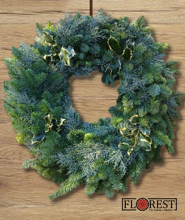 Frischer, handgebundener Kranz aus Koniferen (Tanne, Zypresse, Stechpalme)