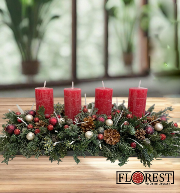 Bringen Sie festliche Stimmung auf Ihren Esstisch mit einem einzigartigen länglichen Adventskranz von Florest – Für Deine Liebsten.
