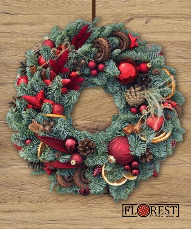 Aus frischem Nadelgrün gefertigt und mit Naturmaterialien, Zapfen, Zimtstangen, getrockneten Orangenscheiben und glänzenden Kugeln geschmückt, wird dieser Kranz zum stimmungsvollen Blickfang in der Adventszeit.